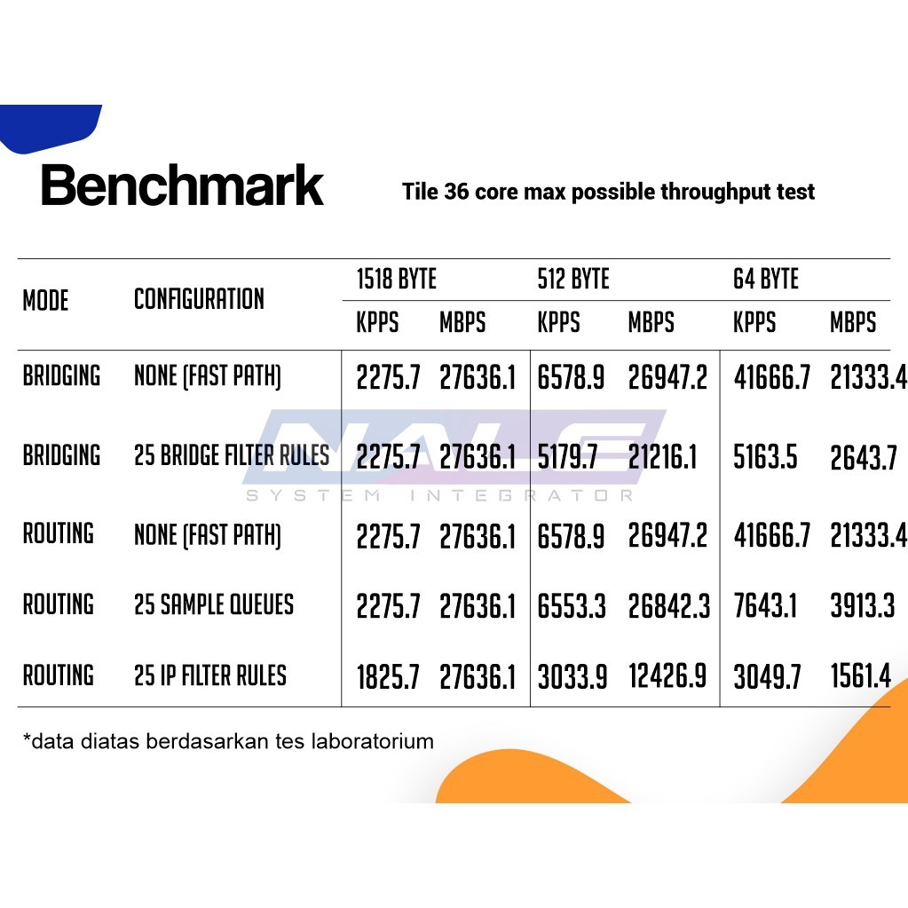 Rackmount 1U, 8x Gigabit Ethernet, 2xSFP + cages, LCD, 36 core x 1.2GHz CPU, 4GB RAM, 41.5mpps fastpath, Throughput hingga 28Gbit / s, RouterOS L6, Dual PSU