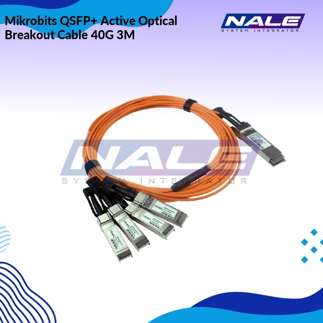 - Mikrobits QSFP40G-AOC4X-3M adalah cabel set yang digunakan untuk menghubungkan antar perangkat standart QSFP+ 40G ke 4 x SFP+ 10G.