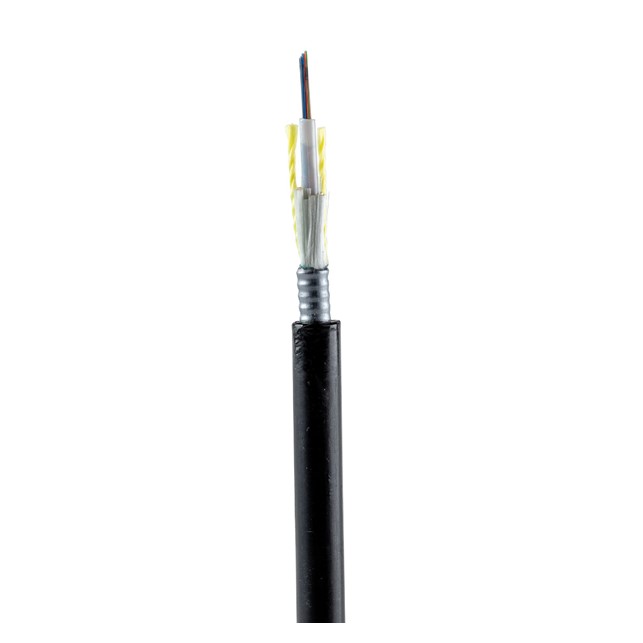 The 12 fiber outside plant armored central tube cable is OM4 and features 250µm fibers.