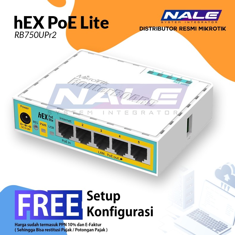 hEX PoE lite adalah router ethernet lima port kecil dalam wadah plastik, ia memiliki port USB 2.0 dan keluaran PoE.
