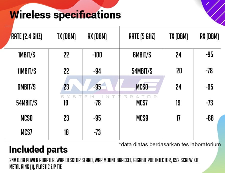 Sudah termasuk 24V 0.8A power adapter, wAP desktop stand, wAP mount bracket, Gigabit PoE injector, K52 screw kit, Metal ring (1), Plastic zip tie